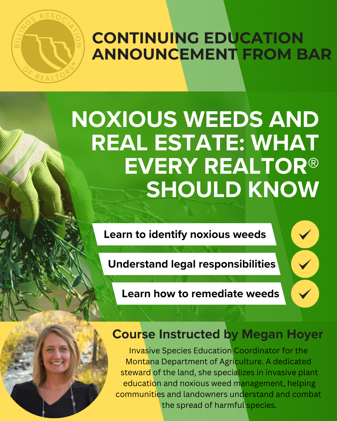 This course teaches you how to better identify noxious weeds and how to remediate them. You will also learn and understand the legal responsibilities. This course is instructed by Megan Hoyer.