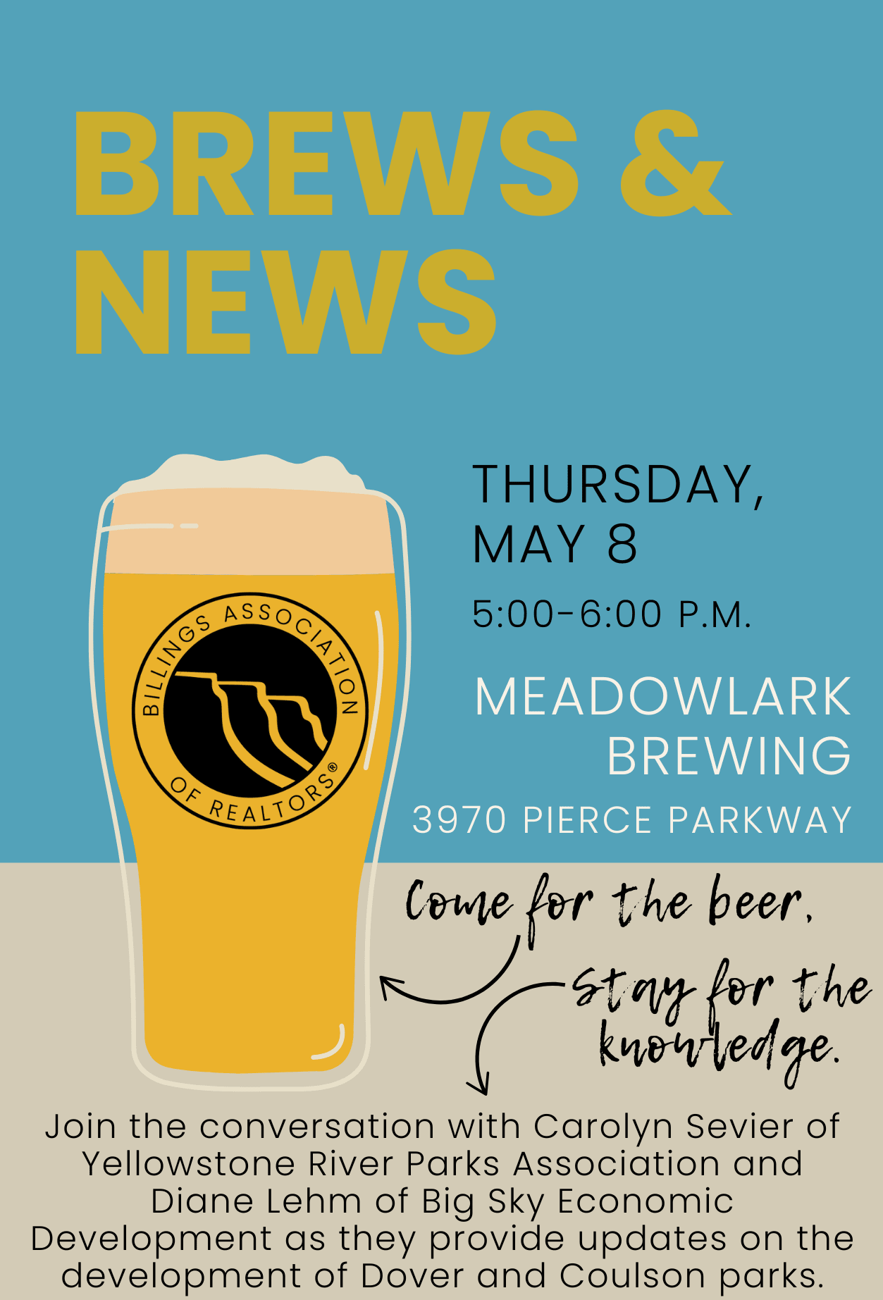 Join us for a drink and conversation with Carolyn Sevier of Yellowstone River Parks Association and Diane Lehm of Big Sky Economic Development as they provide updates on the development of Dover and Coulson parks.